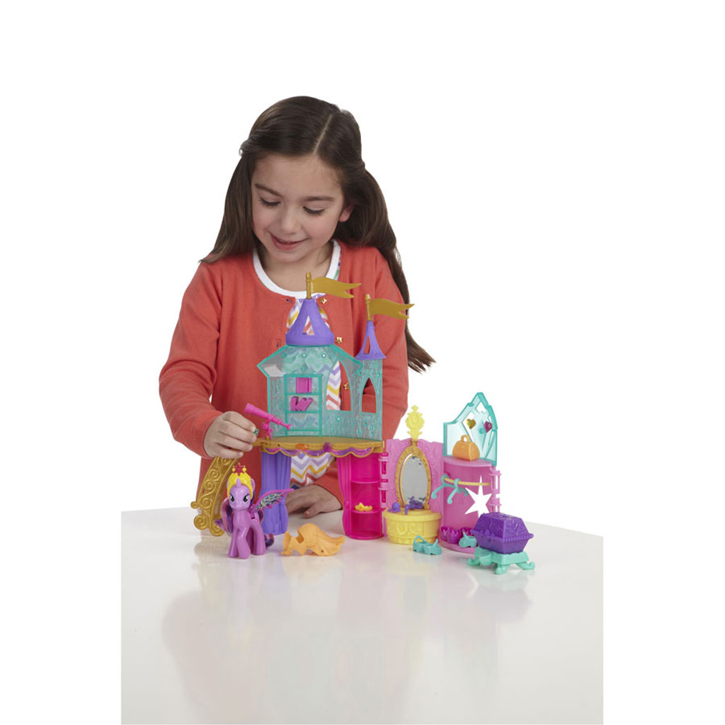 My Little Pony Princess Twilight Sparkle pony has become a true princess and has her very own princess palace. Share in her excitement as you help her get ready for the spectacular Crystal Princess Celebration in her honor. The wonder of this special occasion comes alive with the Crystal Princess Palace playset, which features more than 20 accessories to help Princess Twilight Sparkle get ready for her big celebration. From her dress and shoes to a tiara and jewelry, the Crystal Princess Palace playset has everything she needs for her special day. The playset includes My Little Pony Princess Twilight Sparkle pony, with wings that move. It will be so much fun to dress her up in her special dress and jewelry, choose from 2 different sets of shoes, use the hair dryer, hair clips and tiara to style her hair, then use the pretend perfume bottle for the finishing touch. And you can do all of this in front of her spinning mirror on the palace wall! My Little Pony Princess Twilight Sparkle pony can look out on from her princess castle with the telescope, read her book, keep secrets and treasures in her treasure chest, and dress up in different outfits. There’s even a special bridge that can connect to the Pony Princess Wedding Castle playset (sold separately) so you can have lots more fun celebrating this pony princess world.
